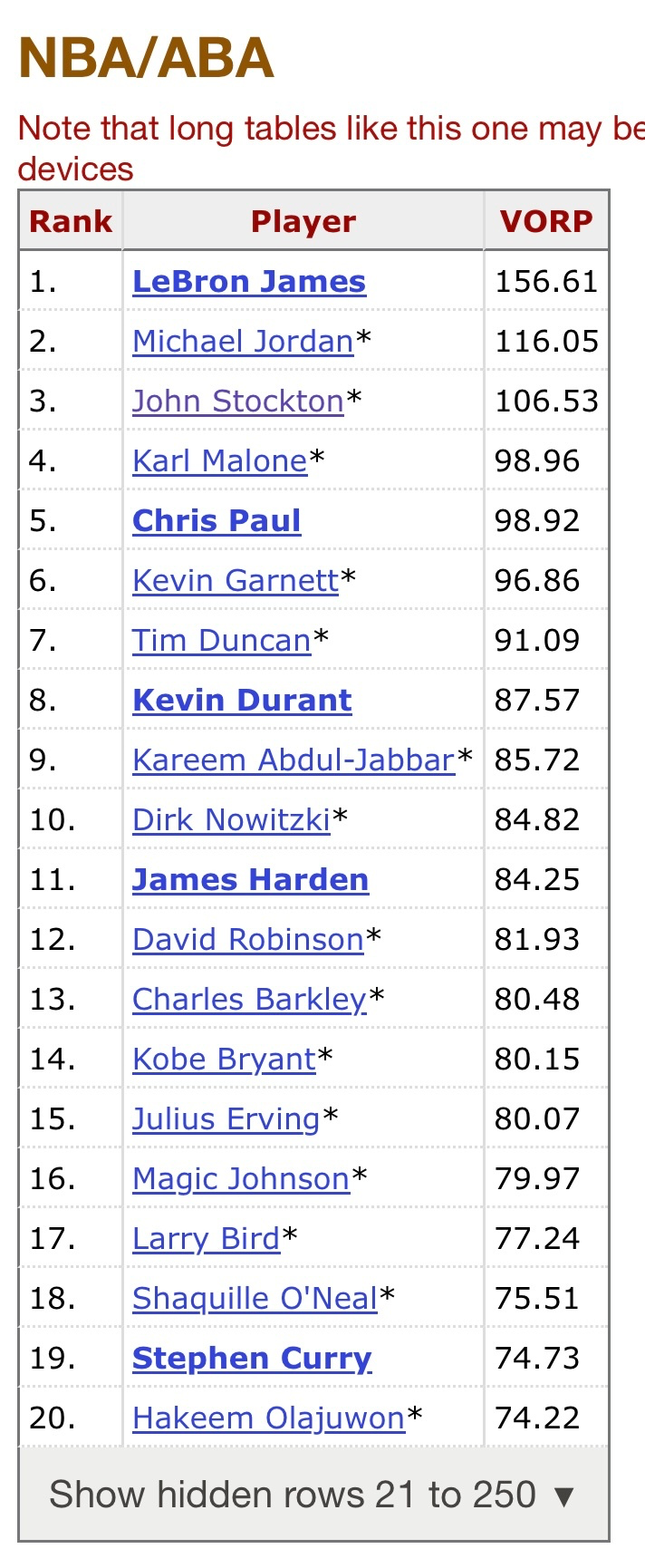 历史前十是:詹姆斯、乔丹、斯托克顿、马龙、保罗、加内特、邓肯、杜兰特、贾巴尔。都是赫赫有名能提升球员的超巨。接下来是:诺维茨基、哈登、罗宾逊、巴克利、科比、J博士、魔术师、伯德、奥尼尔、库里、奥拉朱旺。科比排名第14位置,VORP是80.15,落后乔丹超过30,差不多只有詹姆斯的一半。库里排名第19,VORP是75.73,还没詹姆斯的一半。科比和库里的VORP都不如他们的历史地位,科比历史第十或第11,库里历史第11或第十。