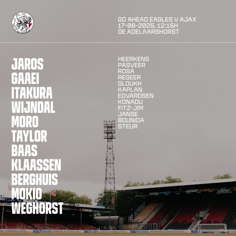 荷甲联赛第二轮即将打响,阿贾克斯将于北京时间8月17日18:15客场挑战前进之鹰。