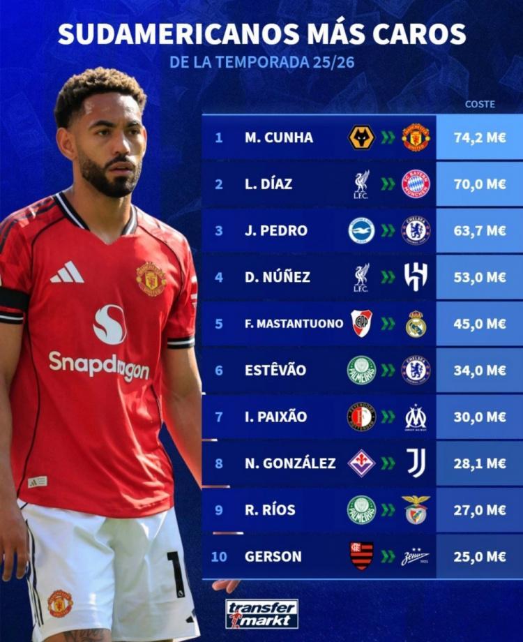 直播吧8月26日讯 转会市场盘点了今年夏窗截至目前南美球员转会费榜单,其中库尼亚居首,迪亚斯次席,具体榜单如下: