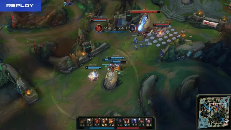 第三分钟:DRX辅助游走上路配合队友发起攻势,撤退途中击杀赶来支援的瑞兹,顺利拿下一血